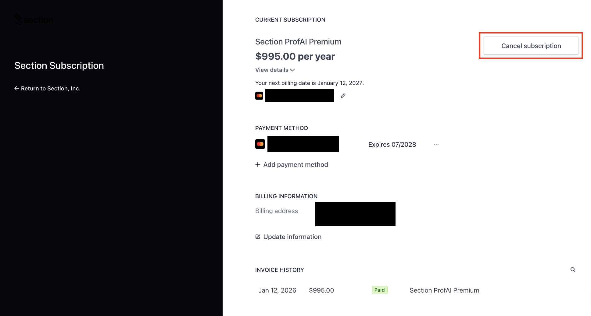 If you believe this is the right choice for you, you can do so from within your account. Simply log in to your account and click the profile icon in the top right corner and select the "Manage Billing" option. On the Stripe page, click the "Cancel Subscription" button in the top right corner.